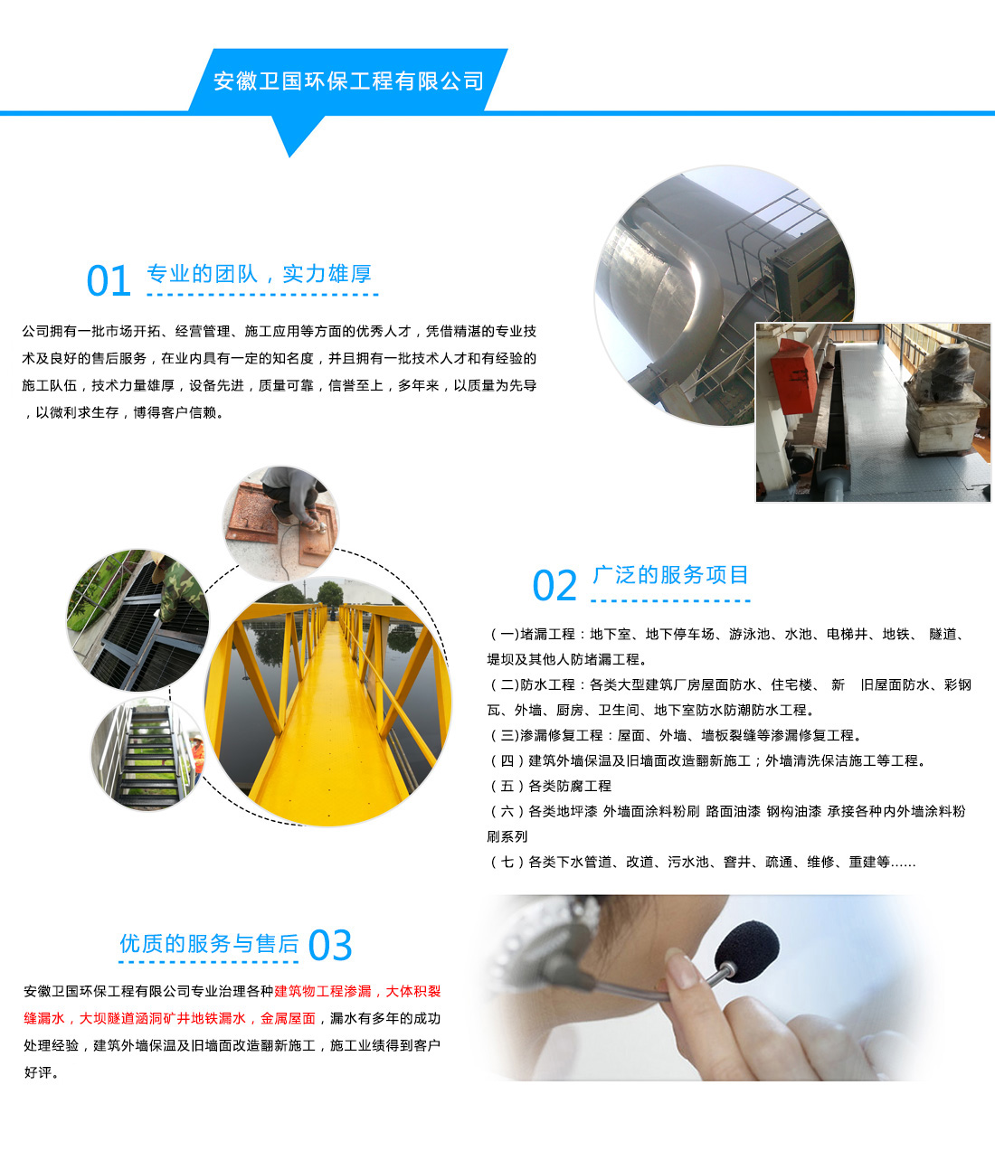 安徽衛(wèi)國(guó)環(huán)保工程有限公司專(zhuān)業(yè)治理各種建筑物工程滲漏,大體積裂縫漏水,大壩隧道涵洞礦井地鐵漏水,金屬屋面,漏水有多年的成功處理經(jīng)驗(yàn),建筑外墻保溫及舊墻面改造翻新施工,施工業(yè)績(jī)得到客戶好評(píng)。
